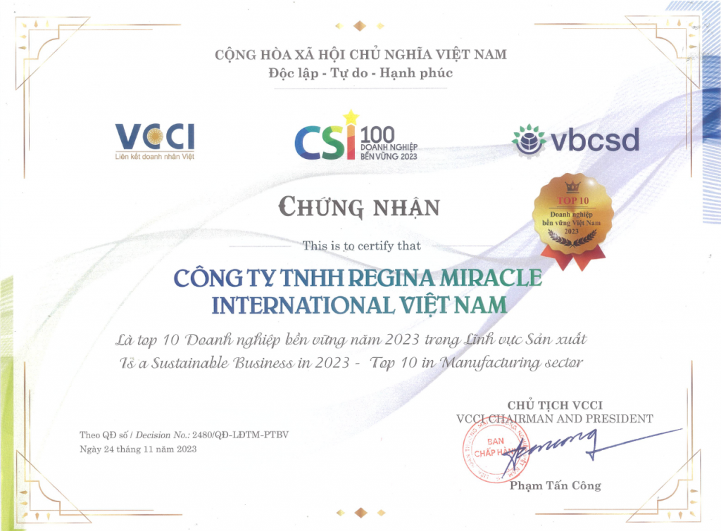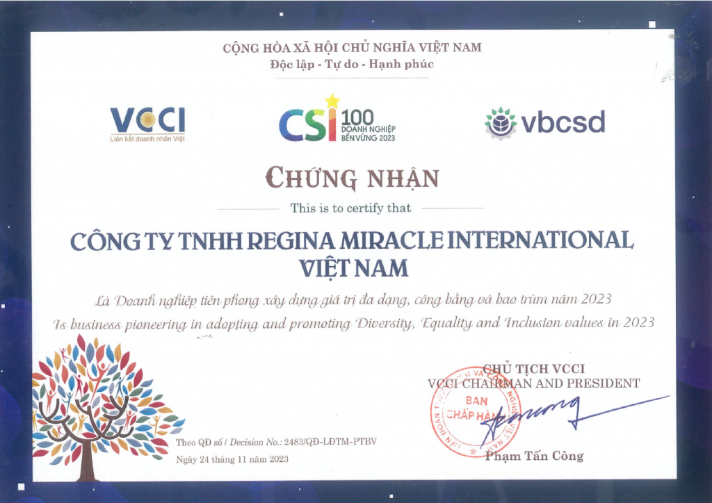 (Hong Kong, 19 December 2023) — Regina Miracle International (Holdings) Limited, a leading innovative design manufacturer (“IDM”) of intimate wear in the world, (“Regina Miracle” or the “Company”, together with its subsidiaries the “Group”) (stock code: 2199) has been recognised in The Corporate Sustainability Index 2023 published by the Vietnam Chamber of Commerce and Industry and has secured a position among the “Top 100 Sustainable Businesses in Vietnam” for the third consecutive year. Notably, this year marks its debut inclusion in the “Top 10 Sustainable Businesses in the Manufacturing Sector”. Additionally, the Group has also earned a place as one of the “Top 5 Pioneering Businesses in Adopting and Promoting Diversity, Equality and Inclusion Values in 2023”, demonstrating its commitment to maintaining a balance among economic, social and environmental benefits for the community’s long-term well-being.